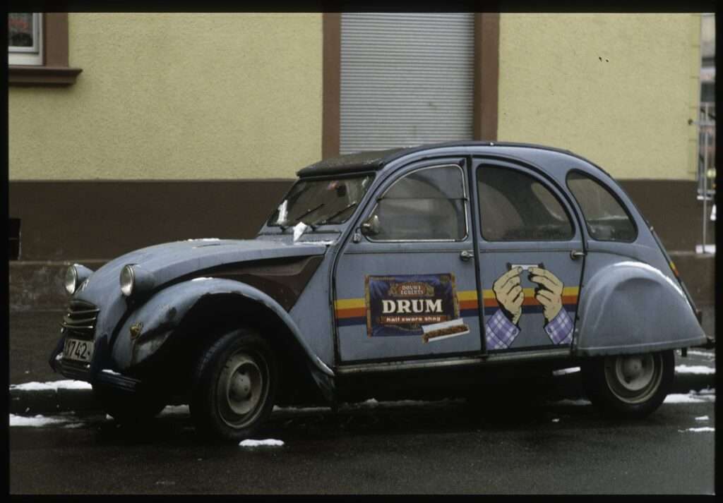 Die Firma Douwe Egberts hat eine geniale Idee. Für den R4 und die 2CV Fahrer boten sie eine ganz spezielle Werbung an. Es gab einige grosse Folien, die man auf sein Auto kleben musste, bzw. das machte eine Werbefirma. Auf der Motorhaube eine überdimensionale offene Tabakpackung und an den Seiten wurde gezeigt, wie die Zigarette gedreht wurde.