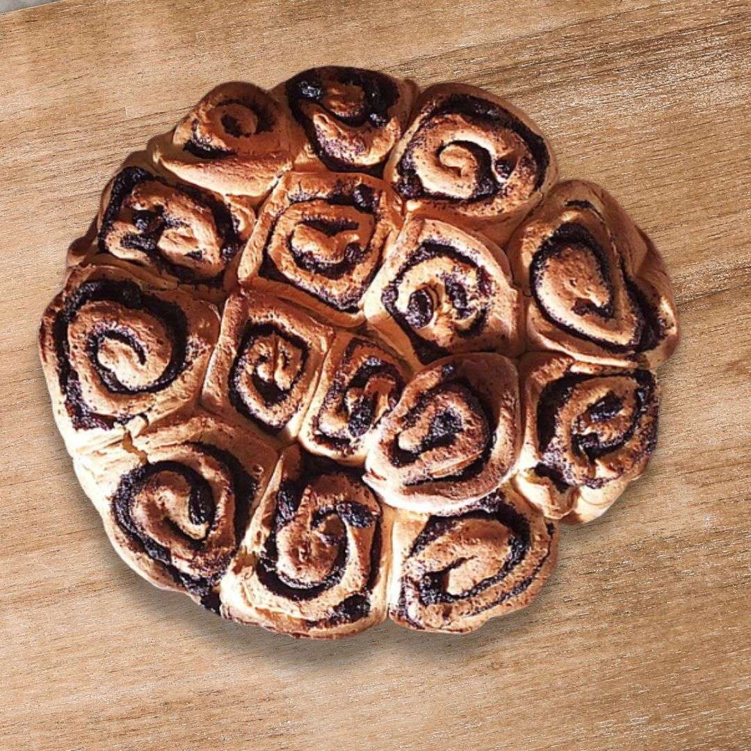 Nach dem Aufrollen des Teiges entsteht eine grosse lange Walze, die dann in kleinere Abschnitte geschnitten werden und dadurch die Rosette bilden.
