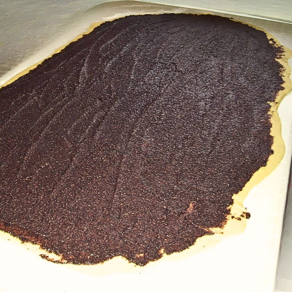 Nachdem der Hefeteig mehrmals aufgegangen ist, wird er auf der gesamten Tischplatte ausgerollt und mit der Mischung aus gemahlenem Mohn, Brommbeergelee und … für das Aufrollen vorbereitet.